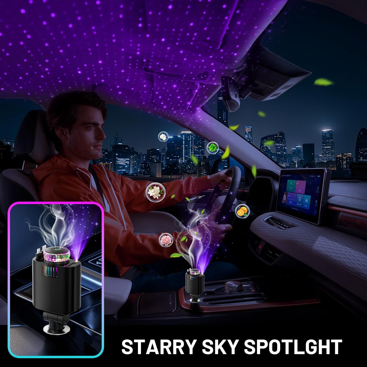 Transform your car with fast charging, LED starlight, and refreshing aroma in one sleek device.