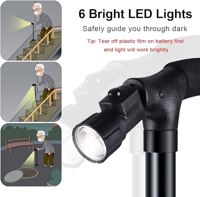 - Built-in 6 Waterproof LED Lights: The cane features LED lighting, ensuring you stay visible at all times, especially when getting up at night. Perfect for night walks, midnight snacks, or seeing in the dark. The bright light safely guides you without the need for a separate flashlight.